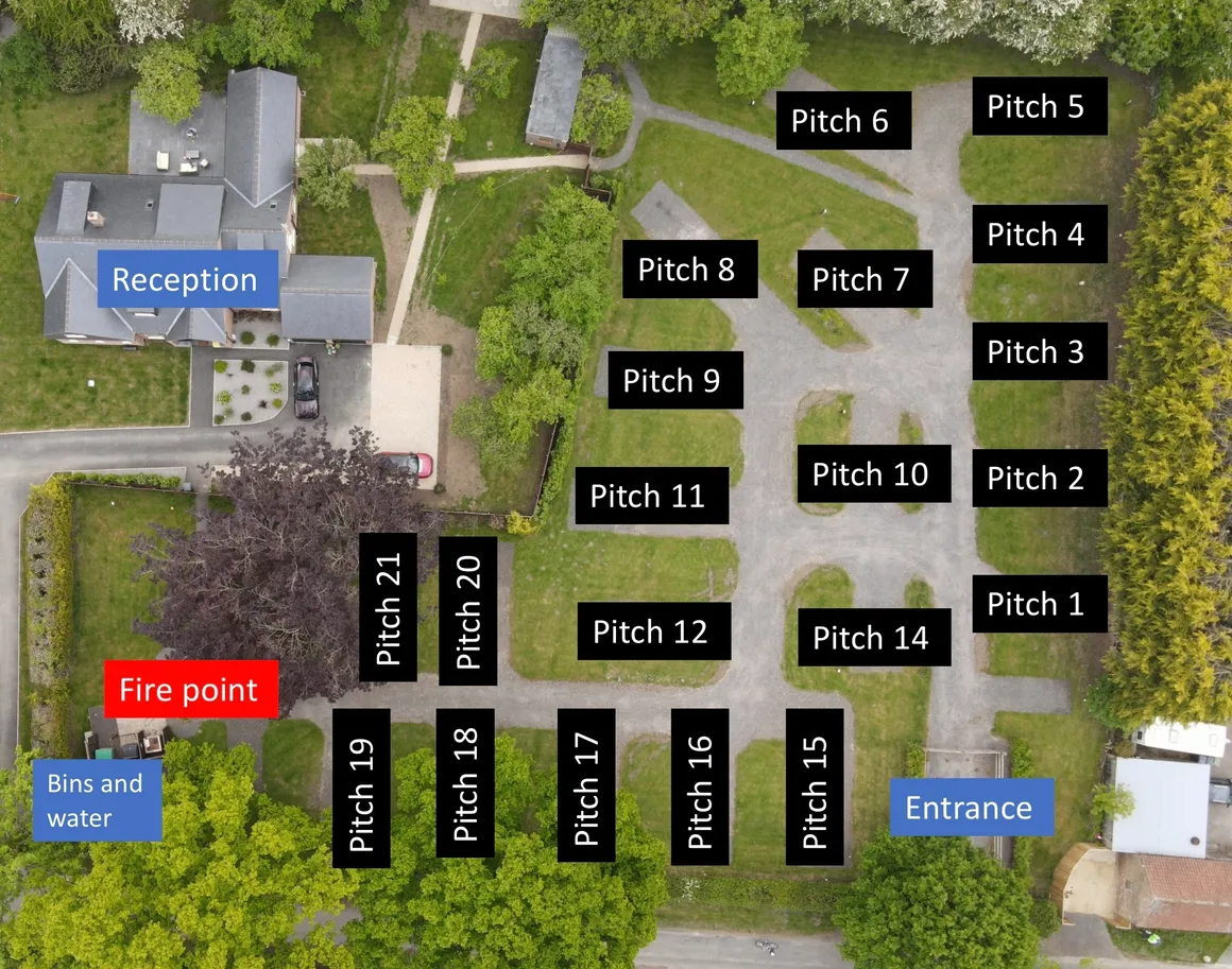 Sheltered pitches surrounded by mature trees, offering peace, privacy, and countryside charm.